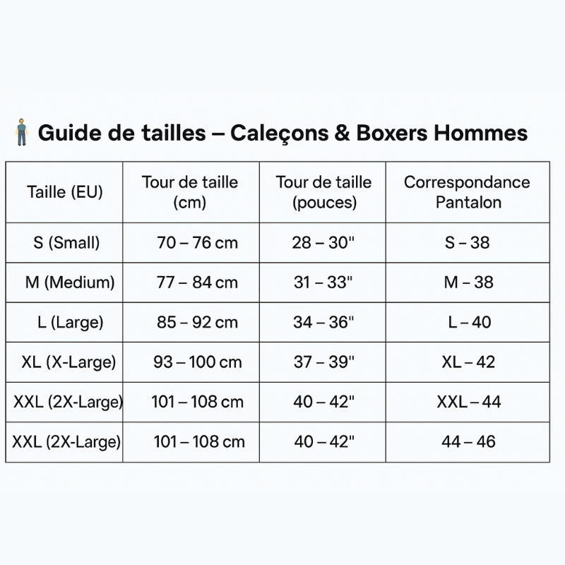Trouver le bon caleçon, c’est avant tout choisir la taille qui vous convient parfaitement. Ce guide vous aide à identifier la taille idéale selon vos mensurations, pour un confort optimal et un maintien adapté.